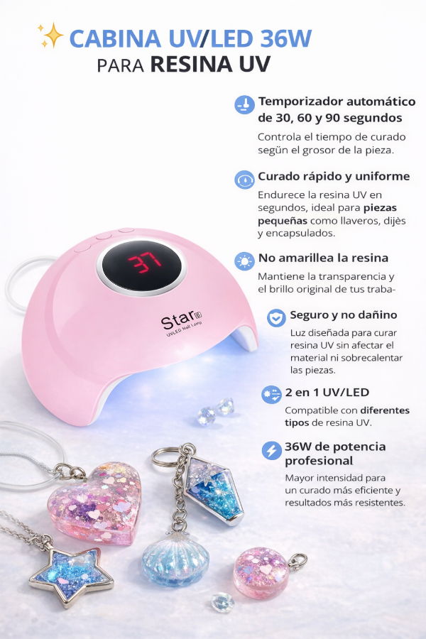 Ideal para trabajos de manicura profesional y proyectos creativos con resina UV como llaveros, joyería y encapsulados.